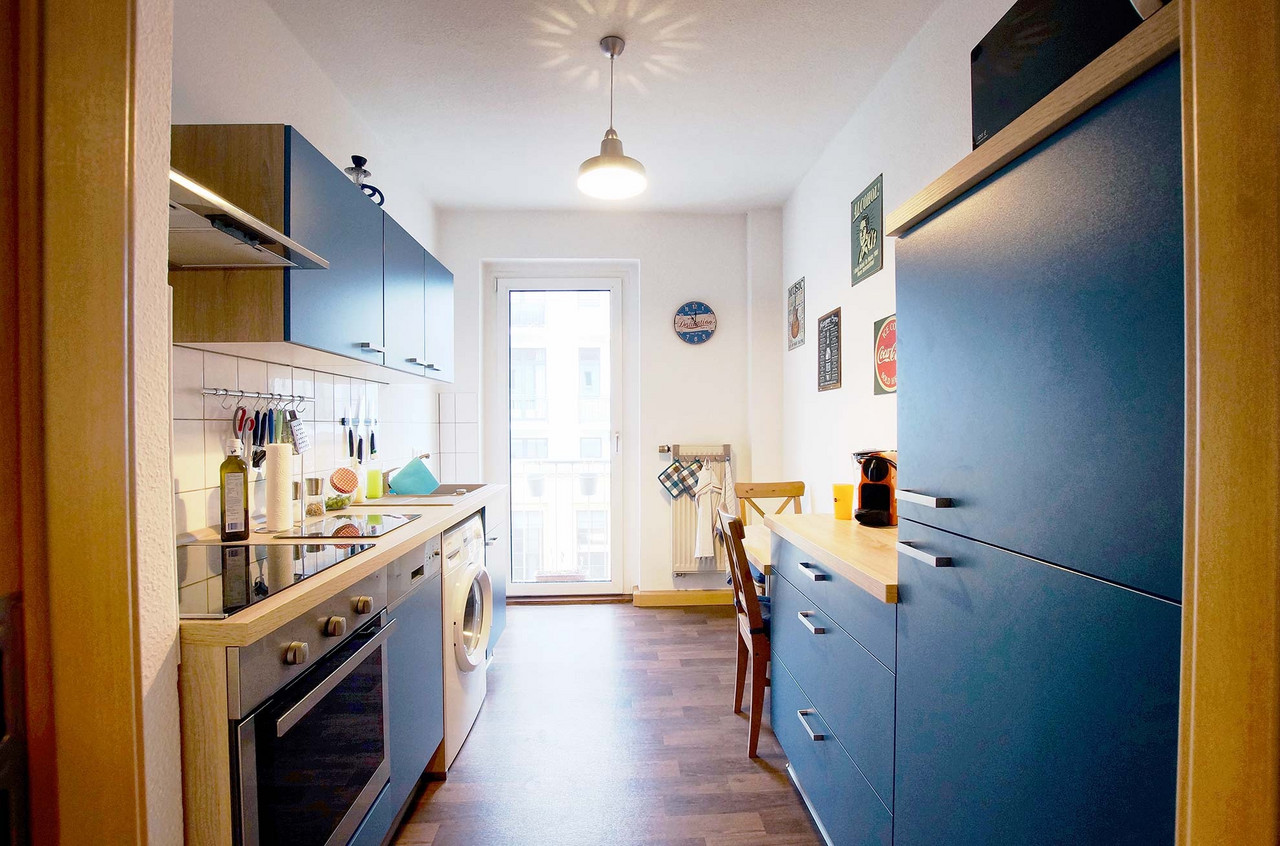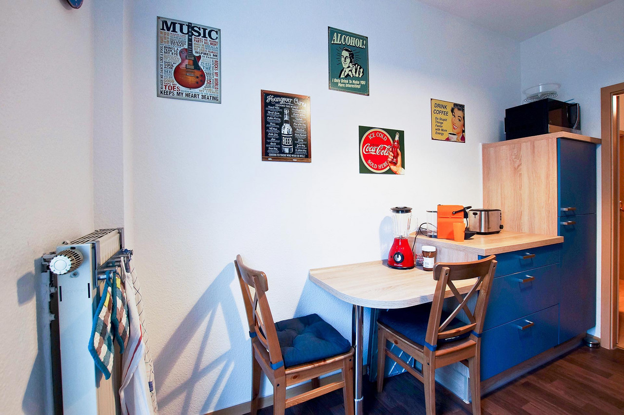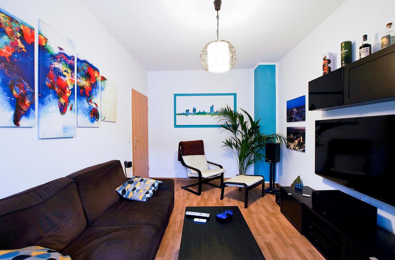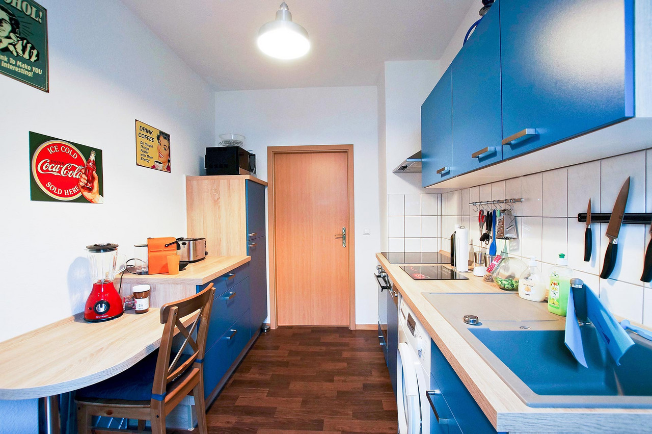 Männer-Wohlfühlzimmer Philipp S. Was ein Männer-Wohlfühlzimmer ist? Eine bequeme Couch steht drin, es gibt einen großen Fernseher, eine Playstation (FIFA) und einen am Tisch fest installierten Flaschenöffner. Man muss kein chronischer Biertrinker sein, um das gut zu finden – meinen jedenfalls die Freunde, wenn sie zum Chillen oder Zocken kommen. Für Philipp S. bedeutet Wohnen das Umsetzen eines eigenen Stils, vielleicht auch einer Haltung. Er liebt schwarz, kombiniert mit Farben. Sie sind bewusst als Möbelfronten, breite Farbstreifen an Wänden oder angedeuteten Rahmen eingesetzt. Das Blau in der Küche hat es ihm angetan. Mit Hilfe von OBI hat er entsprechend der räumlichen Gegebenheiten und dem französischen Fenster als Dominante die Küchenmöbel selbst gebaut. Einige der Emailleschilder hat er sich aus den USA mitgebracht. Er war schon mehrmals dort, vor allem im warmen Florida. Die Connewitzer Wohnung ist seine Basisstation für die Reisen, zu den Konzerten im Coney Island, für die Ausflüge in den Auenwald, zur Constanze oder in die Südbrause und zum monatlichen Essen im Freundeskreis mit wechselnder Gastronomie. Der Außendienstler ist dienstlich und privat viel unterwegs. Oft auch mit Kamera. Landschafts- und Architekturfotografie sind sein Metier. Und wenn es doch mal an der nötigen Motivation mangelt, schätzt er seinen Balkon, insbesondere im Sommer. Vergangenes Jahr stand hier eine 2 Meter hohe rote Sonnenblume. Übersicht Geschichtennächste Geschichte vorherige