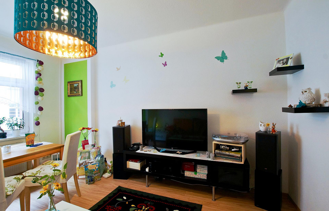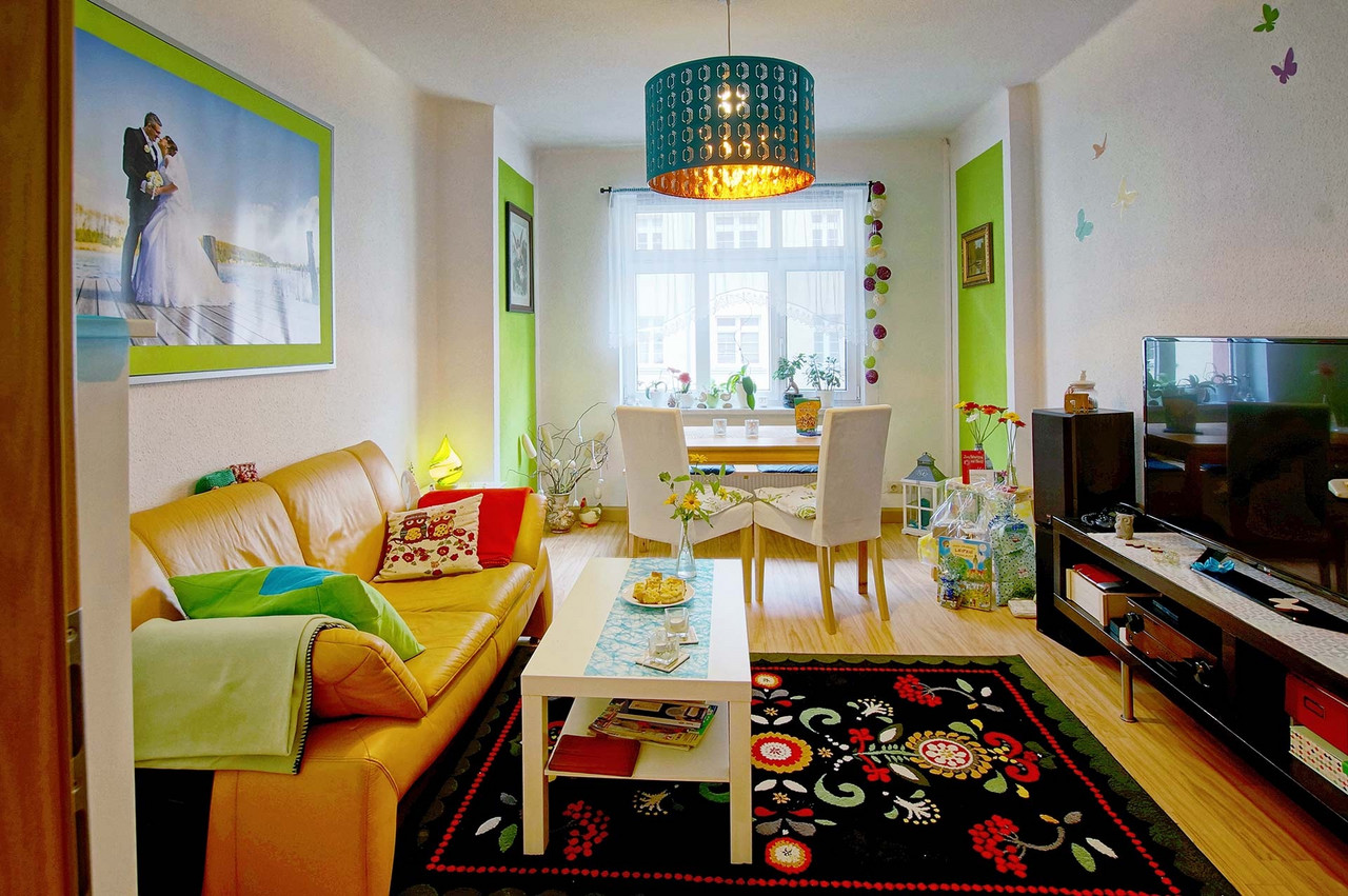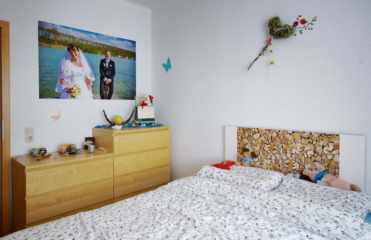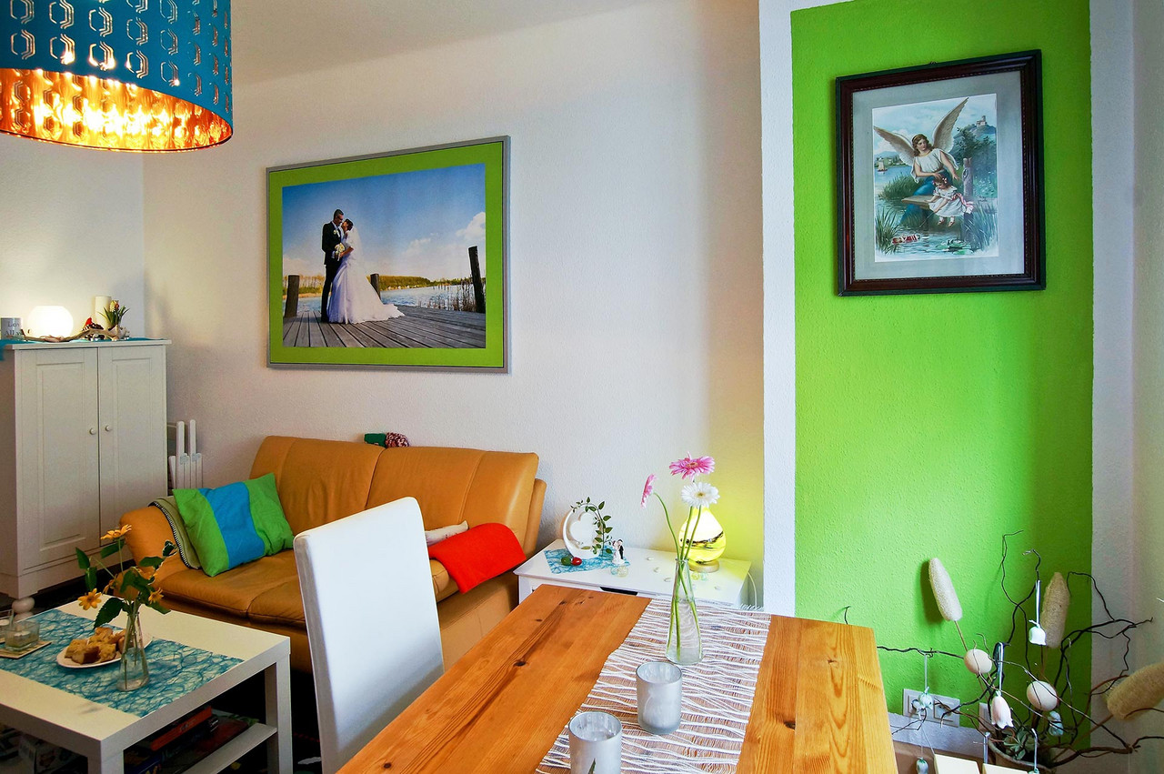 Schmetterlinge Andrea H.-R. und Fabian R. In Frankreich hat er sie gefragt, ob sie seine Frau werden wolle. Das war vor zwei Jahren. 2016 wurde am Hainer See geheiratet. Glanz und Beseeltheit des Paares sind in allen Ecken und Winkeln der Wohnung zu spüren. Auch an der Kühlschranktür. Da sind Fotos von Gerichten, die entweder gemeinsam oder einzeln für die besonderen Momente ihrer Beziehung zubereitet wurden. Zum Kennenlern-Abend, zum ersten Jahrestag oder zu anderen wichtigen Ereignissen. Auf der Rückseite findet sich auch das dazugehörige Rezept. Stimmungsvolle, großformatige Fotos erzählen vom „dem“ Tag, die Hochzeitstruhe birgt nicht nur das Hochzeitskleid, sondern trägt weitere romantische Erinnerungsstücke. Die variabel nutzbare Wohnung in Anger-Crottendorf ist für Andrea H.-R. und Fabian R. ein weiteres Stück zum Glück. Das Preis-Leistungs-Verhältnis passt zum Budget. Der Balkon ist als naturverbundener Rückzugsort der Favorit unter dem Räumen. Ein besonderer Pluspunkt, es ist eine Genossenschaftswohnung, das Solidarprinzip wird als sympathisch empfunden. Sie, die angehende Juristin, bringt bei der Wohnungsgestaltung meist die Ideen ein. Er, Mitarbeiter beim Wege e.V., einem Verein, der sich um Familien und Freunde von psychisch Kranken kümmert, ist gern mit dem Fotoapparat unterwegs. Gemeinsam ist ihnen unter anderem die Liebe zur Musik - er Querflöte, sie Geige, das Unterwegssein – die Campingausrüstung konnte nach der Hochzeit finanziert und vor wenigen Wochen in Italien ausprobiert werden, das gesunde und stressfreie Fahrradfahren - obwohl ein Auto vor der Tür steht - und ihr Engagement in der Neuapostolischen Kirche als Macher und Mitmacher. Ihre Wohnung ist ihr Mittelpunkt, mit der Ausstrahlung beschwingten Frohseins. „All you need is love“ steht auf einem Teelichtschirm. Das trifft es. Übersicht Geschichtennächste Geschichte vorherige