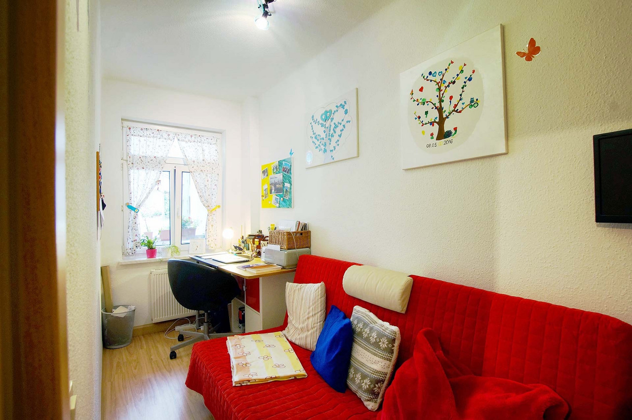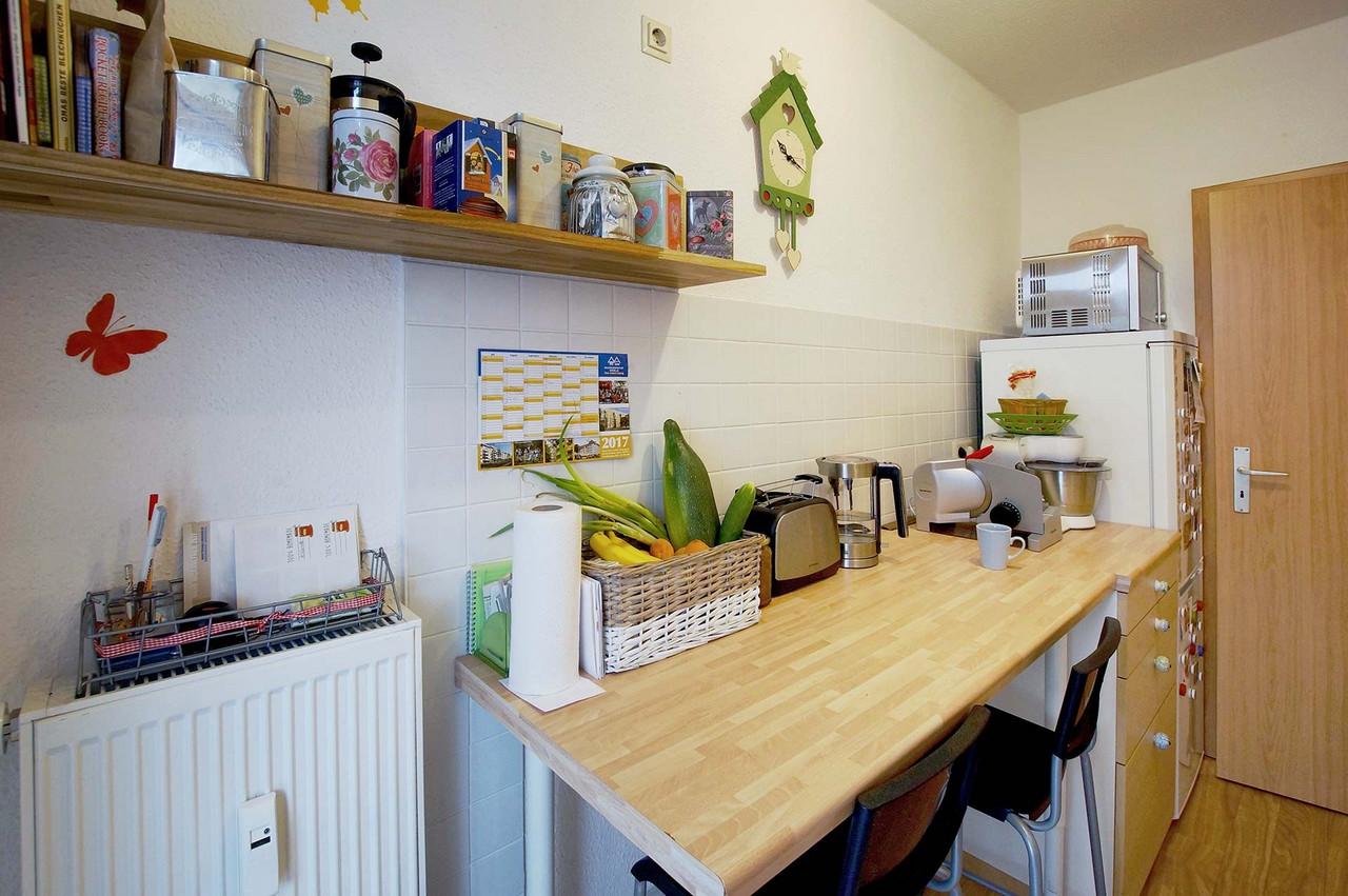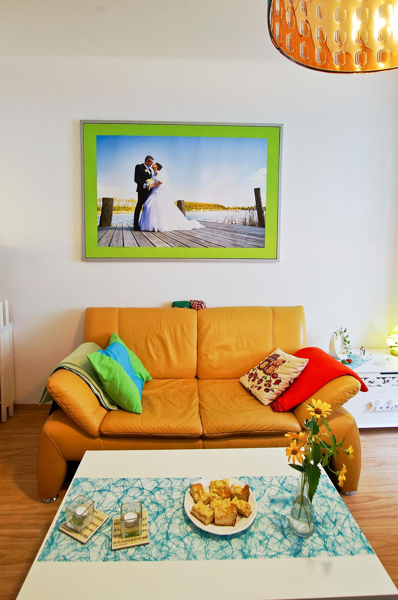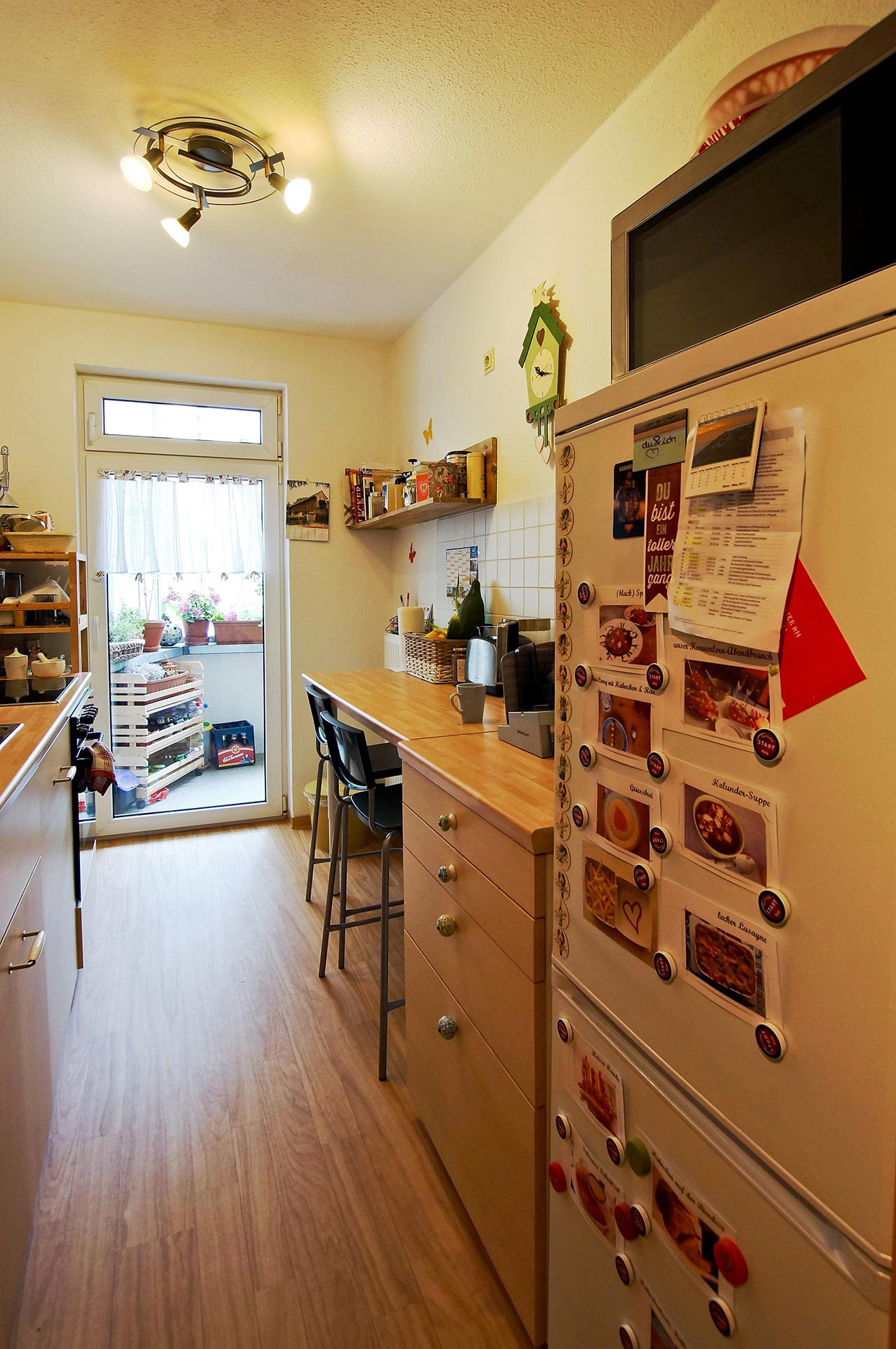 Schmetterlinge Andrea H.-R. und Fabian R. In Frankreich hat er sie gefragt, ob sie seine Frau werden wolle. Das war vor zwei Jahren. 2016 wurde am Hainer See geheiratet. Glanz und Beseeltheit des Paares sind in allen Ecken und Winkeln der Wohnung zu spüren. Auch an der Kühlschranktür. Da sind Fotos von Gerichten, die entweder gemeinsam oder einzeln für die besonderen Momente ihrer Beziehung zubereitet wurden. Zum Kennenlern-Abend, zum ersten Jahrestag oder zu anderen wichtigen Ereignissen. Auf der Rückseite findet sich auch das dazugehörige Rezept. Stimmungsvolle, großformatige Fotos erzählen vom „dem“ Tag, die Hochzeitstruhe birgt nicht nur das Hochzeitskleid, sondern trägt weitere romantische Erinnerungsstücke. Die variabel nutzbare Wohnung in Anger-Crottendorf ist für Andrea H.-R. und Fabian R. ein weiteres Stück zum Glück. Das Preis-Leistungs-Verhältnis passt zum Budget. Der Balkon ist als naturverbundener Rückzugsort der Favorit unter dem Räumen. Ein besonderer Pluspunkt, es ist eine Genossenschaftswohnung, das Solidarprinzip wird als sympathisch empfunden. Sie, die angehende Juristin, bringt bei der Wohnungsgestaltung meist die Ideen ein. Er, Mitarbeiter beim Wege e.V., einem Verein, der sich um Familien und Freunde von psychisch Kranken kümmert, ist gern mit dem Fotoapparat unterwegs. Gemeinsam ist ihnen unter anderem die Liebe zur Musik - er Querflöte, sie Geige, das Unterwegssein – die Campingausrüstung konnte nach der Hochzeit finanziert und vor wenigen Wochen in Italien ausprobiert werden, das gesunde und stressfreie Fahrradfahren - obwohl ein Auto vor der Tür steht - und ihr Engagement in der Neuapostolischen Kirche als Macher und Mitmacher. Ihre Wohnung ist ihr Mittelpunkt, mit der Ausstrahlung beschwingten Frohseins. „All you need is love“ steht auf einem Teelichtschirm. Das trifft es. Übersicht Geschichtennächste Geschichte vorherige