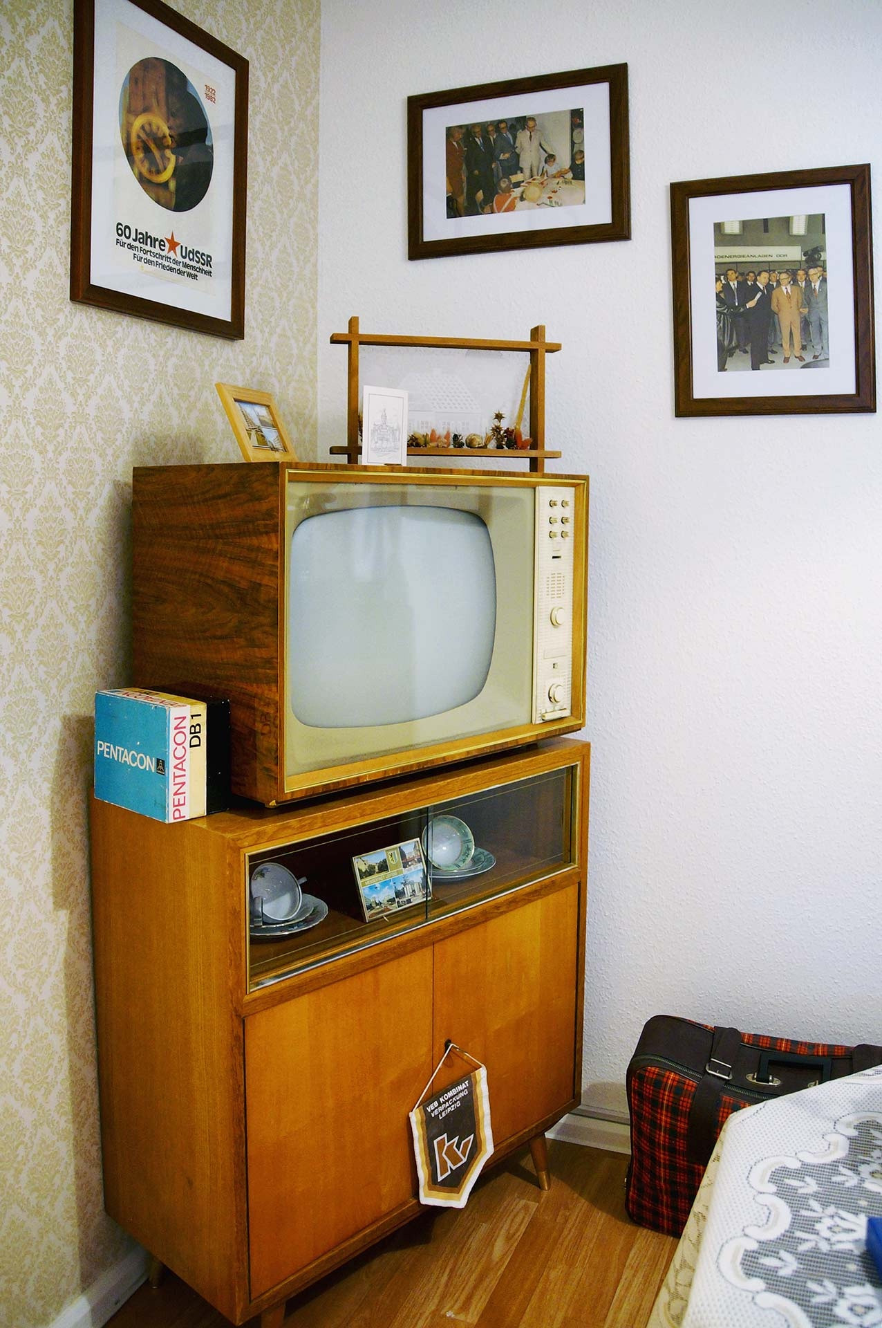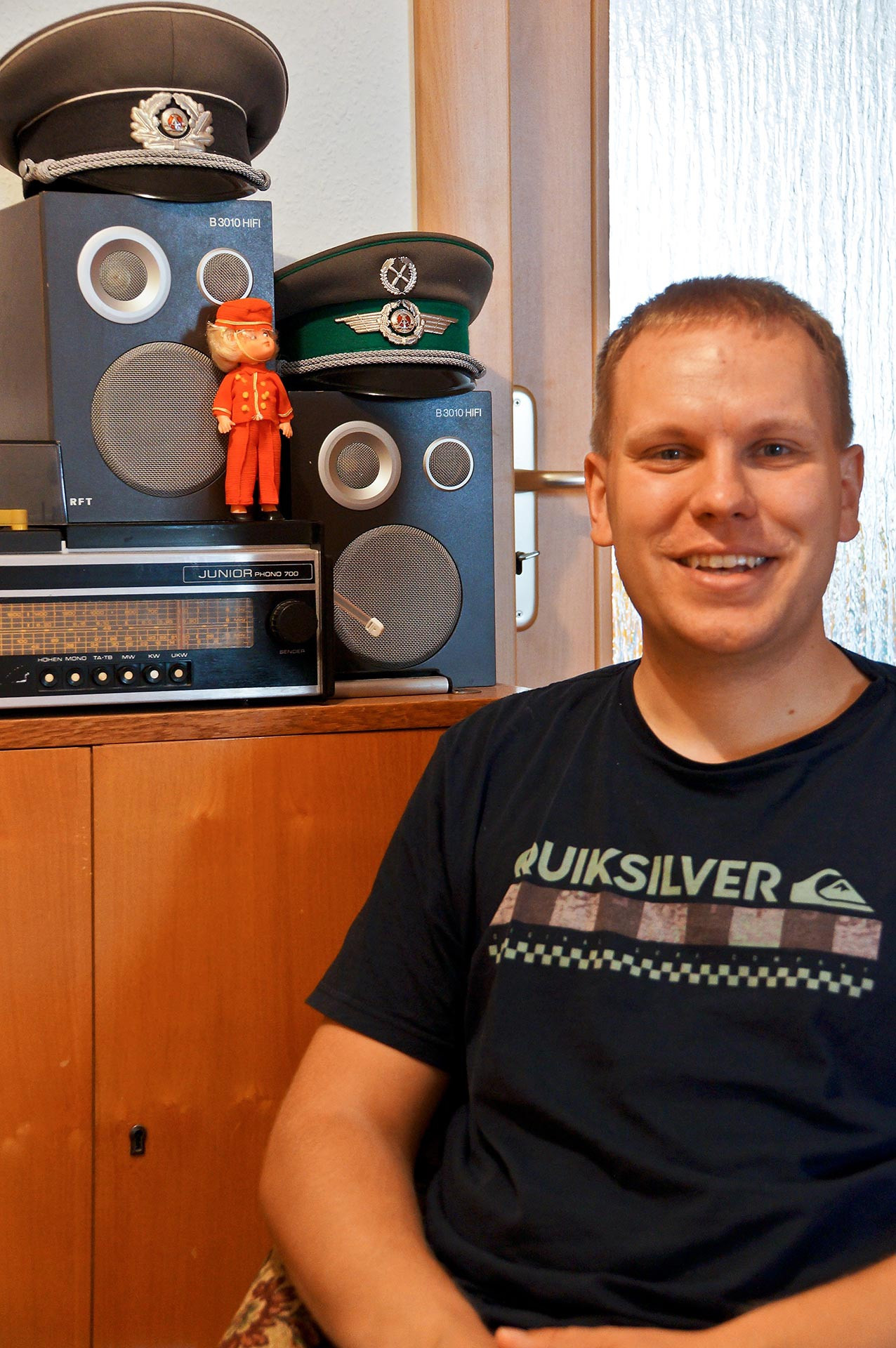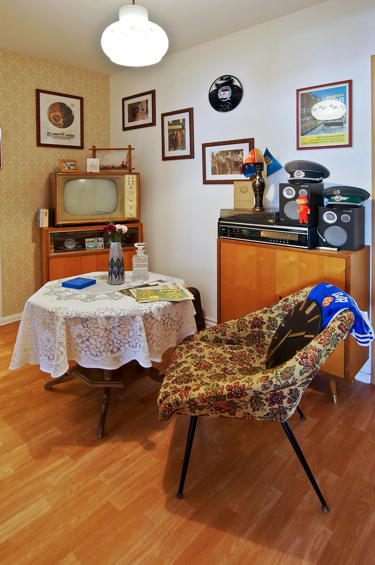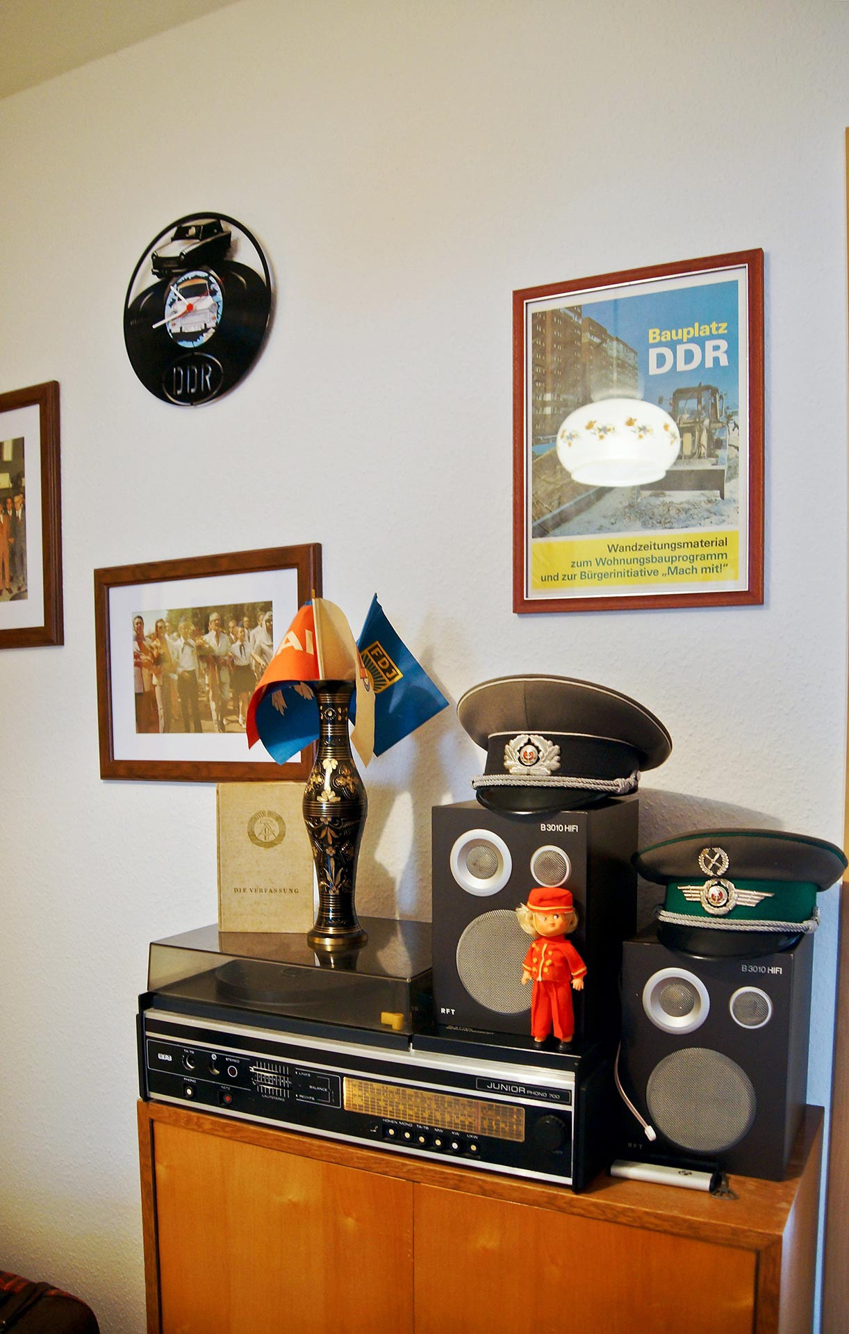 Im himmelblauen Trabant Anja und Lars H. Zugegeben, das Foto seines Trabis in Stretchversion auf dem Time Square in New York ist manipuliert, aber genau dieser steht - etwas kürzer – gut gepflegt in der Garage. Hin und wieder gibt es mal einen Ausflug mit dem 601-er, nicht mehr wie vor Gretchen zum Ostseeurlaub, sondern zum Beispiel zum Treffen im Trabi-Club. Gretchen war auch der Anlass für den letzten Wohnungswechsel. Anja und Lars H. haben mit Wohnungsgenossenschaften gute Erfahrungen gemacht. Deshalb wurde zuerst bei den Leipziger Genossenschaften recherchiert. Das Gesamtpaket sollte stimmen: Wohnungsgröße, Schnitt, Dusche, Stellplatz und Lage - und bezahlbar sollte es auch sein. In Grünau sind sie fündig geworden und mit der Platte haben sie ohnehin keine Berührungsängste. Sie sind zufrieden, alles Wichtige ist fußläufig erreichbar, viele Spielplätze und viel Grün, außer Vogelgezwitscher kein „Lärm“. Ja, durch den Aufzug ist es ein bisschen anonym im Haus. Die direkten Nachbarn rundum sind kinder- und enkelerfahren und entsprechend verständnisvoll, wenn es beim Spielen mal etwas lauter wird. Sicherlich nicht unbedeutend bei der Wohnungssuche: eine Chance für seine DDR-Ecke. Ein mittlerweile historisches Thema, was den Kindergartenleiter schon von klein auf interessierte. Und das, obwohl er, der 1989 zwei Jahre alt war, eher mit Lego, Tamagotchi oder Jojo groß geworden ist. Die Sammlung wird umfangreicher: Erbstücke, Geschenke von Freunden oder der Familie und Flohmarkterwerbungen. Erweitern lässt sich die mit DDR-Originaltapete dekorierte Ecke nicht, deshalb wird jahreszeitentsprechend umgestaltet. Manchmal sitzt Lars H. in „seiner“ Ecke und hört LP-KLassiker: „Zigeuner auf Zeit“ von IC Falkenberg oder Gerd Christian. Anja H., Erzieherin, ist für die Ausschmückung vom Rest der Wohnung zuständig. Afrika hat es ihr angetan. Giraffen, Elefanten, Affen und die Menschen, die dort leben. Ein toller Spannungsbogen: eine Rückblende auf die jüngere Geschichte Deutschlands ohne Verklärung und ein Ausblick mit Fernweh. Übersicht Geschichtennächste Geschichte vorherige