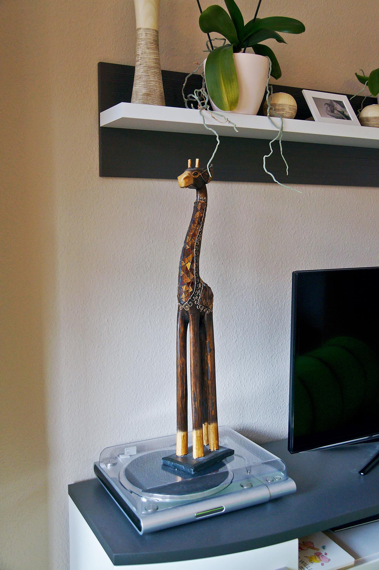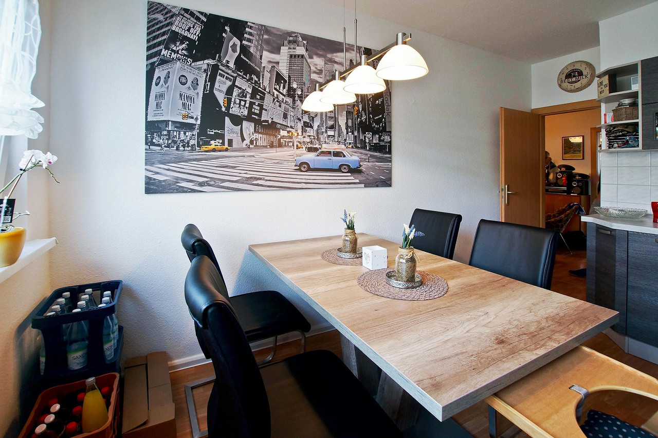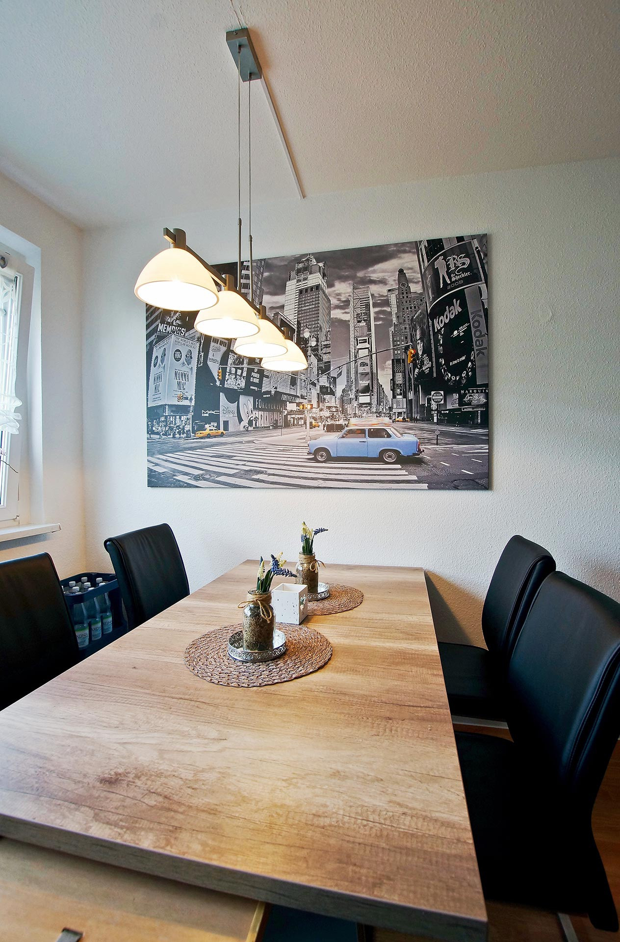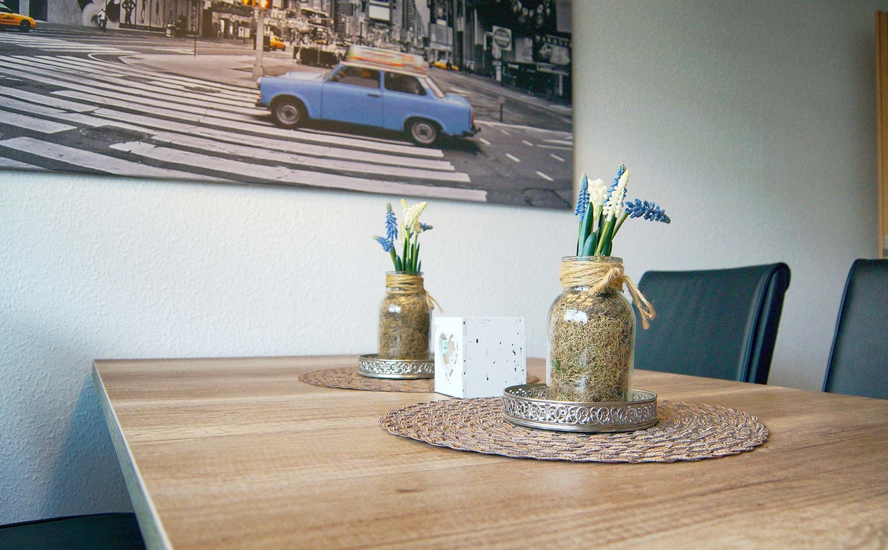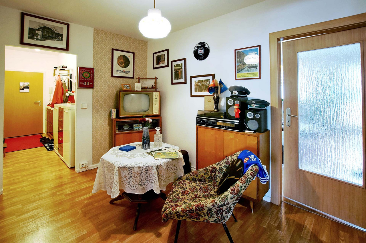 Im himmelblauen Trabant Anja und Lars H. Zugegeben, das Foto seines Trabis in Stretchversion auf dem Time Square in New York ist manipuliert, aber genau dieser steht - etwas kürzer – gut gepflegt in der Garage. Hin und wieder gibt es mal einen Ausflug mit dem 601-er, nicht mehr wie vor Gretchen zum Ostseeurlaub, sondern zum Beispiel zum Treffen im Trabi-Club. Gretchen war auch der Anlass für den letzten Wohnungswechsel. Anja und Lars H. haben mit Wohnungsgenossenschaften gute Erfahrungen gemacht. Deshalb wurde zuerst bei den Leipziger Genossenschaften recherchiert. Das Gesamtpaket sollte stimmen: Wohnungsgröße, Schnitt, Dusche, Stellplatz und Lage - und bezahlbar sollte es auch sein. In Grünau sind sie fündig geworden und mit der Platte haben sie ohnehin keine Berührungsängste. Sie sind zufrieden, alles Wichtige ist fußläufig erreichbar, viele Spielplätze und viel Grün, außer Vogelgezwitscher kein „Lärm“. Ja, durch den Aufzug ist es ein bisschen anonym im Haus. Die direkten Nachbarn rundum sind kinder- und enkelerfahren und entsprechend verständnisvoll, wenn es beim Spielen mal etwas lauter wird. Sicherlich nicht unbedeutend bei der Wohnungssuche: eine Chance für seine DDR-Ecke. Ein mittlerweile historisches Thema, was den Kindergartenleiter schon von klein auf interessierte. Und das, obwohl er, der 1989 zwei Jahre alt war, eher mit Lego, Tamagotchi oder Jojo groß geworden ist. Die Sammlung wird umfangreicher: Erbstücke, Geschenke von Freunden oder der Familie und Flohmarkterwerbungen. Erweitern lässt sich die mit DDR-Originaltapete dekorierte Ecke nicht, deshalb wird jahreszeitentsprechend umgestaltet. Manchmal sitzt Lars H. in „seiner“ Ecke und hört LP-KLassiker: „Zigeuner auf Zeit“ von IC Falkenberg oder Gerd Christian. Anja H., Erzieherin, ist für die Ausschmückung vom Rest der Wohnung zuständig. Afrika hat es ihr angetan. Giraffen, Elefanten, Affen und die Menschen, die dort leben. Ein toller Spannungsbogen: eine Rückblende auf die jüngere Geschichte Deutschlands ohne Verklärung und ein Ausblick mit Fernweh. Übersicht Geschichtennächste Geschichte vorherige