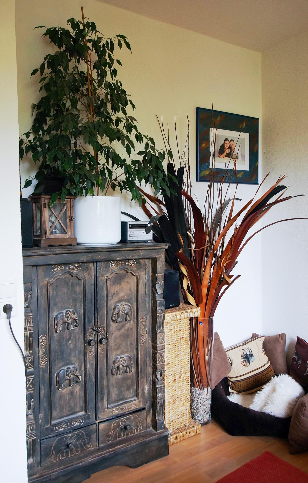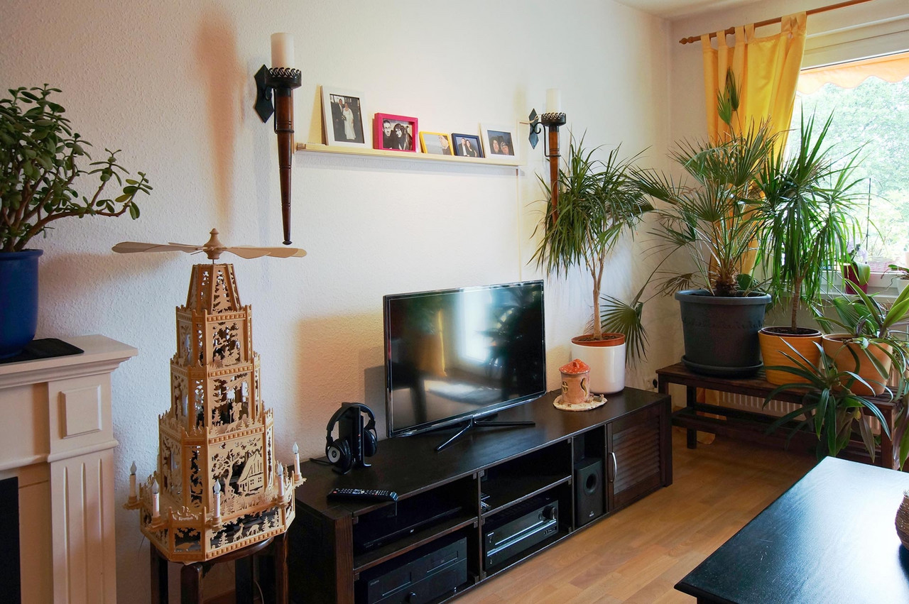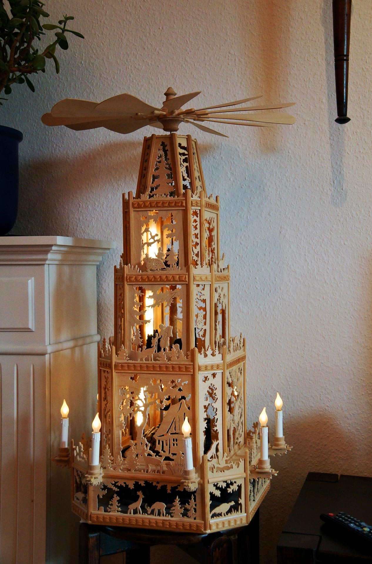 Die Pyramide Elisabeth und Mike H. Mike H. musste 1 ½ Jahre zuhause bleiben, krankheitsbedingt. Eine lange Zeit für einen aktiven, beidbeinig im Leben stehenden Menschen. Er fing an zu handwerkeln, erst Kleineres, dann Schuh- und Fernsehschrank und die Pyramide. Für die Nachbarn gelegentlich etwas strapaziös, für Mike H. eine selbstgewählte Aufgabe mit sehenswerten, alltagstauglichen Ergebnis. Kennt man den Entstehungshintergrund wirkt die Pyramide anheimelnd, romantisch und detailverliebt und man spürt dennoch dieses „trotzdem“, das sich nicht „unterkriegenlassen“. Ehefrau Elisabeth H. hat Respekt für das Geleistete und ist stolz auf das Geschaffene und den Erbauer. Und so passt natürlich die Pyramide als Flaggschiff erzgebirgischer Handwerkskunst auch problemlos in das südamerikanisch angehauchte Flair des Wohnzimmers – eine kleine Reminiszenz an einen längeren Aufenthalt von Elisabeth H. in Bolivien. Im Schlafzimmer ist eher Afrikafeeling angesagt. Und an vielen Stellen ist fantasievoll-schöpferisches von beiden zu finden. Holzschnitte und Tonarbeiten von ihr, Holzarbeiten und der „grüne Daumen“ auf Balkon und in der Wohnung von ihm. „Don“ ist der Dritte im Bund - ein Hund, klug, sanft und anhänglich. Gelegentlich flitzt Don auf der Eilenburger Rennbahn dem Dummy (vermeintlicher Hase) hinterher oder reist etwas widerwillig, weil wasserscheu, mit seinen Herrchen an die von beiden sehr gemochte Ostsee. Lieblingsplatz aller Drei ist die Couch (eng beieinander) vor dem Kamin. Übersicht Geschichtennächste Geschichte vorherige
